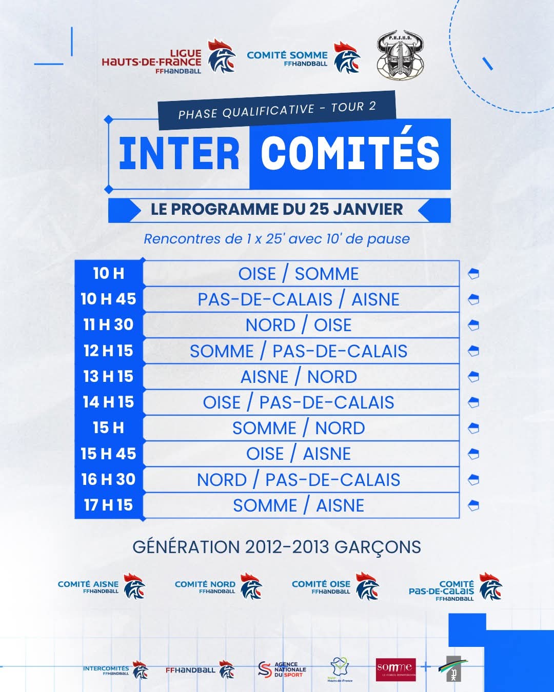 Tout le programme des Inter comités ci-dessous, où le LMHL sera fièrement représenté par nos jeunes joueuses et joueurs, ainsi que notre jeune arbitre. Ils défendront les couleurs du Nord face aux autres départements : Oise, Somme, Pas-de-Calais, Aisne lors de ce tournoi pour les générations 2012-2013 filles et garçons