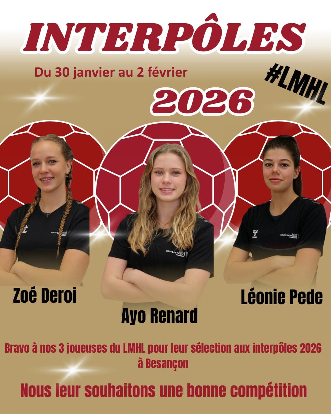 Du 30/01/2026 au 02/02/2026 se déroulent les interpoles 2026 à Besançon. Le LMHL y sera représenté avec nos 3 joueuses : Zoé, Ayo et Léonie. Nous leurs souhaitons une belle compétition. Tout le LMHL sera derrière vous ! Allez les filles !!